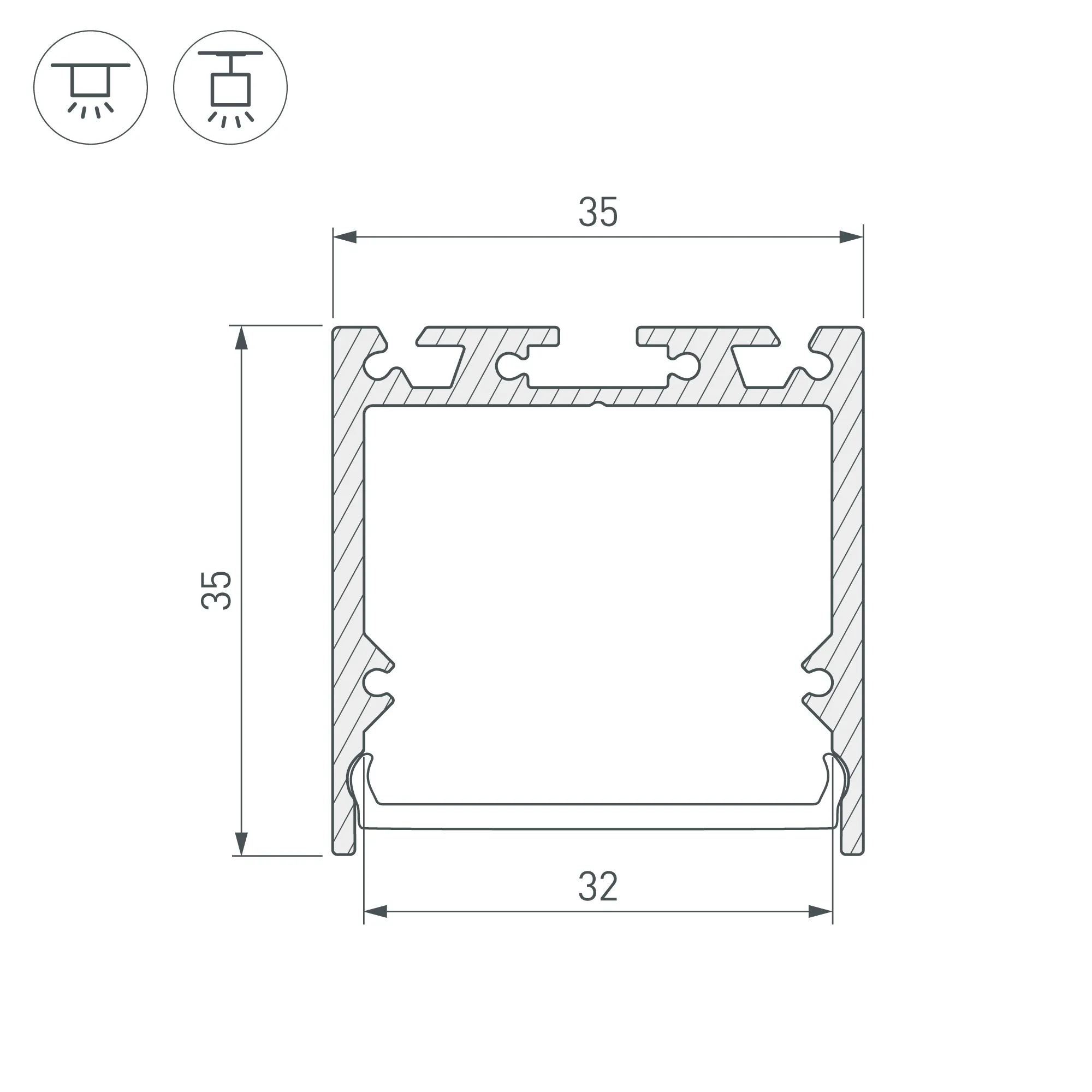 Алюминиевый анодированный профиль для светодиодных лент и линеек. Габаритные размеры (L×W×H): 2000x35x35 мм. Ширина площадки для ленты 31 мм. Экраны, заглушки и другие аксессуары приобретаются отдельно. Цена за 1 метр.