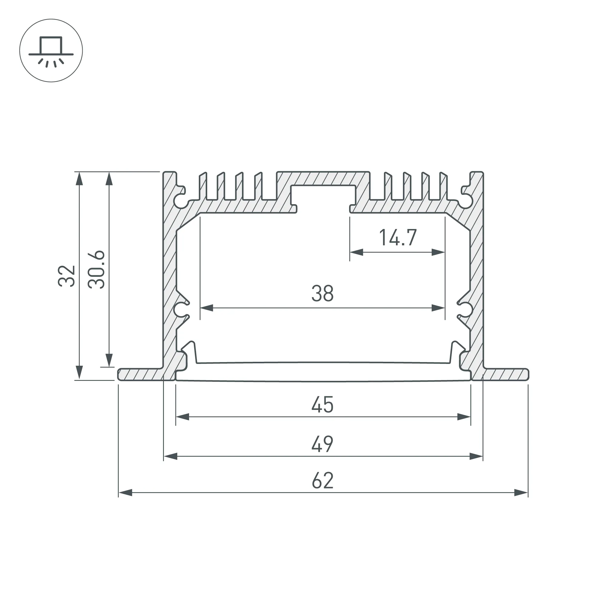 Комплект с экраном. Алюминиевый анодированный профиль для светодиодных лент и линеек. Габаритные размеры (L×W×H): 2500x62x32 мм, паз для установки 49 мм. Ширина площадки для ленты 38 мм. Аксессуары приобретаются отдельно. Цена за комплект.