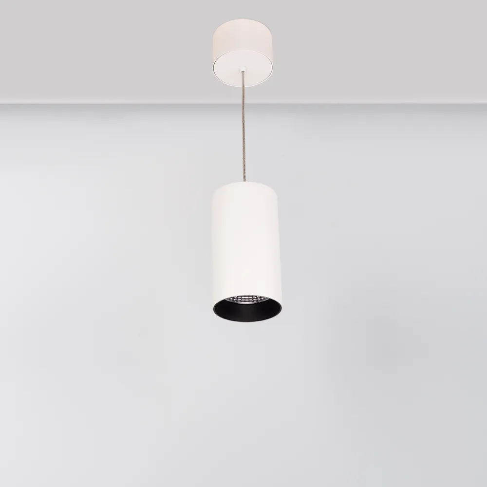 Подвесной светильник 15Вт, белый круглый корпус, черная вставка, металл. Цвет ТЕПЛЫЙ БЕЛЫЙ 3000K, св.поток 1100лм, CRI(Ra)>80, угол 40°. Размер Ø85x155мм. Встроенный драйвер PRI:220-240VAC, SEC:DC 350mA 23-36V 15Вт.
