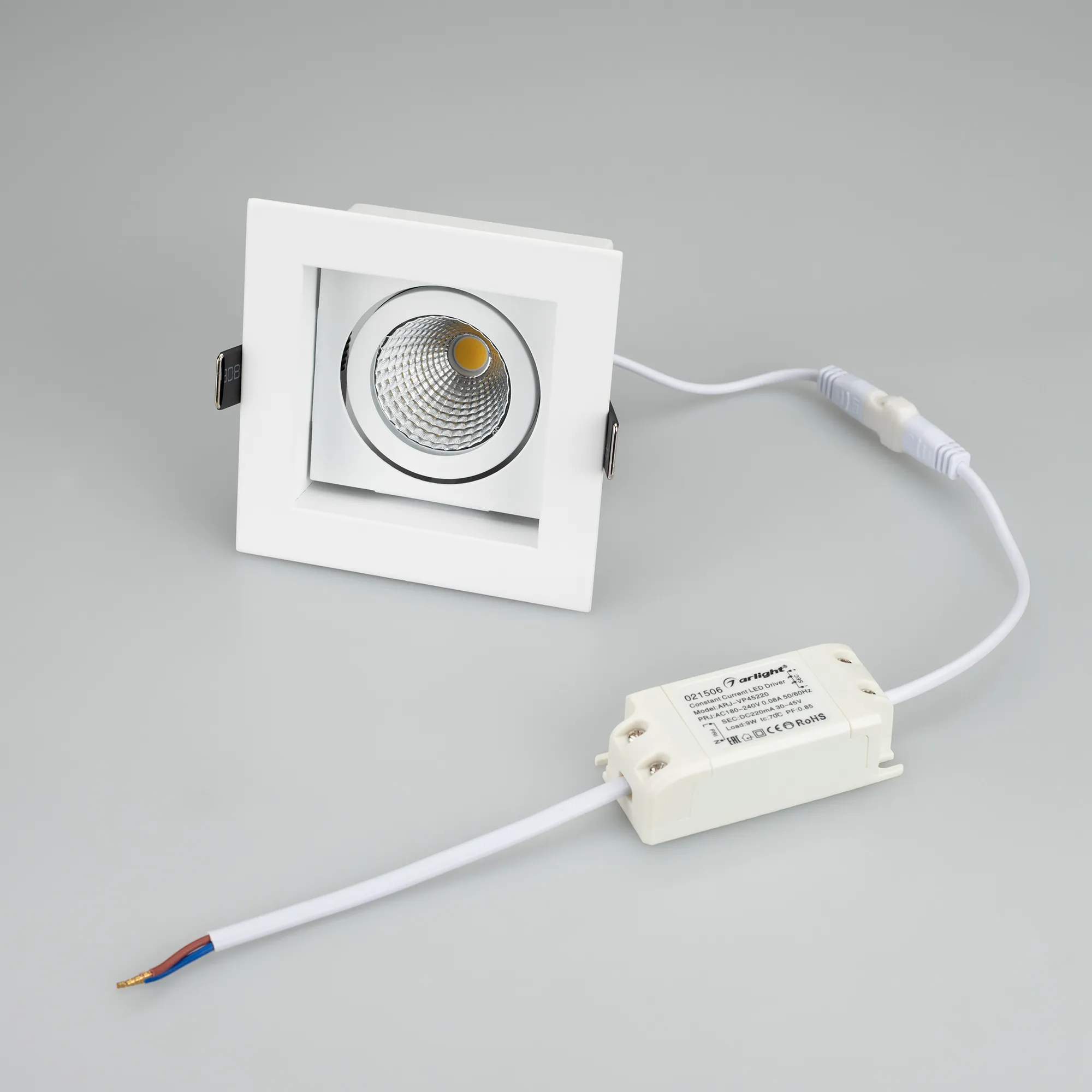 Встраиваемый карданный светильник. Угол 38° / 9Вт / ТЕПЛЫЙ БЕЛЫЙ 3000K / 680лм, CRI>80. Корпус из белого алюминия. Питание AC180-240V, 9Вт, в комплекте драйвер 200mA 30-45V. Размеры LxWxH: 102х102x85мм, отверстие для установки 85x85мм.