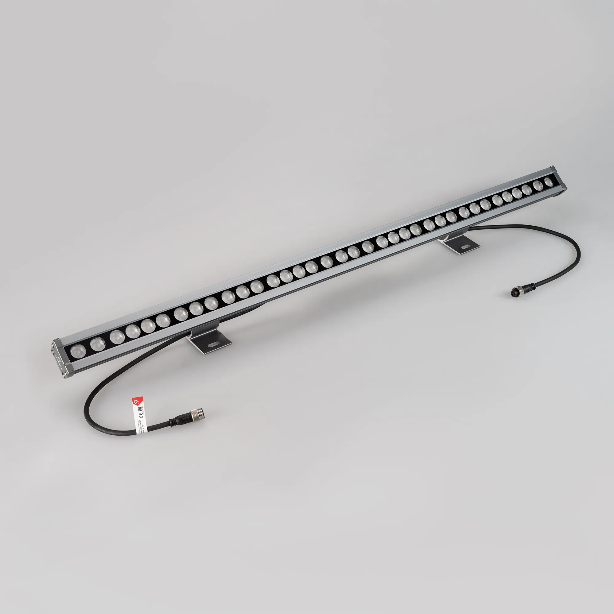 Линейный светодиодный прожектор. Мощность 36W, напряжение питания AC 230V. Светодиоды OSRAM 36 штук. Цвет светодиодов тёплый белый 3000K, световой поток 3600 Lm, угол рассеивания 30°. Корпус: алюминиевый сплав и армированное стекло. Цвет корпуса серый, степень влагозащиты IP65. Габариты 1000x78x55мм.