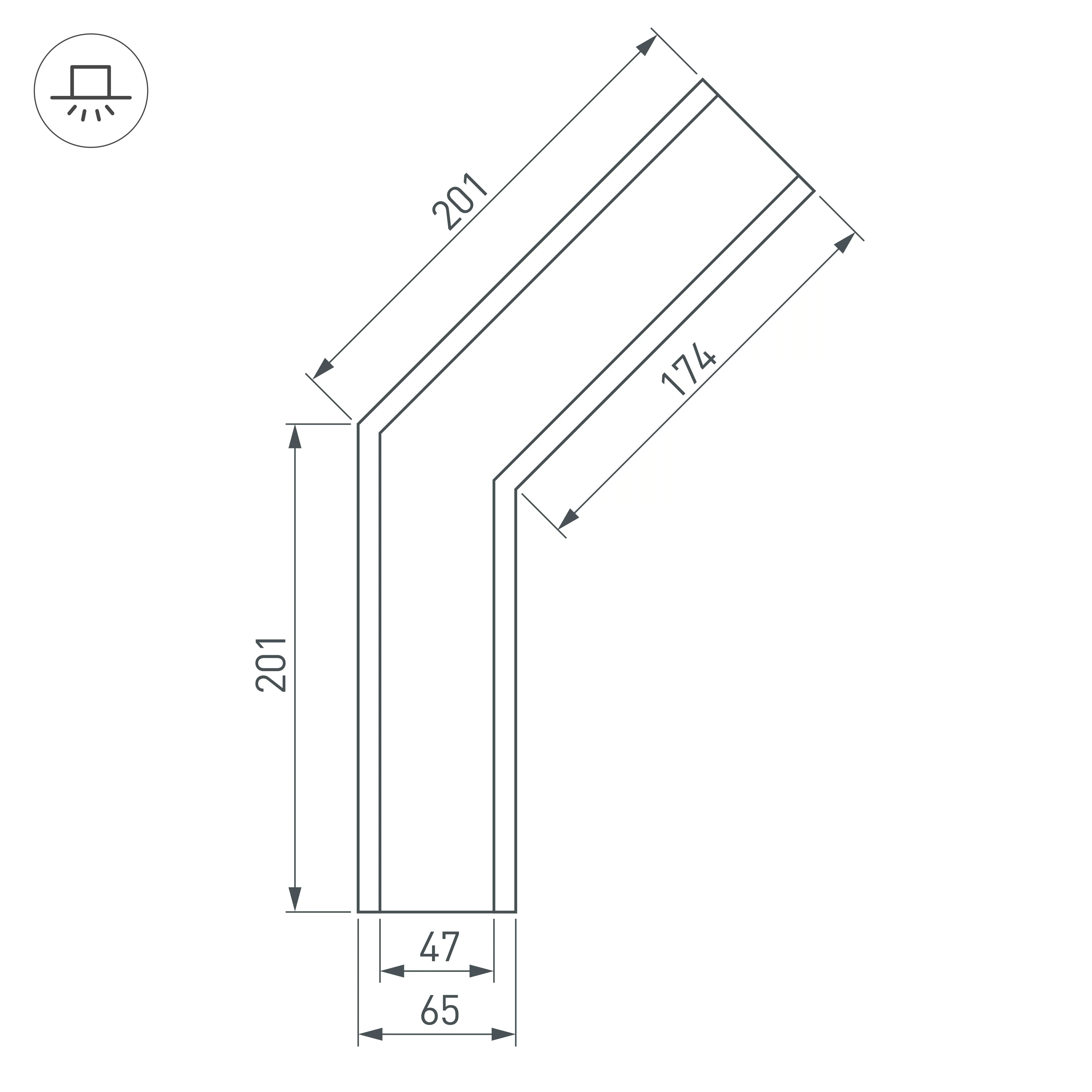 Угол в сборе, для профиля SL-LINIA65-F. 135°. В комплекте угол с экраном, соединители, винты, шестигранный ключ.