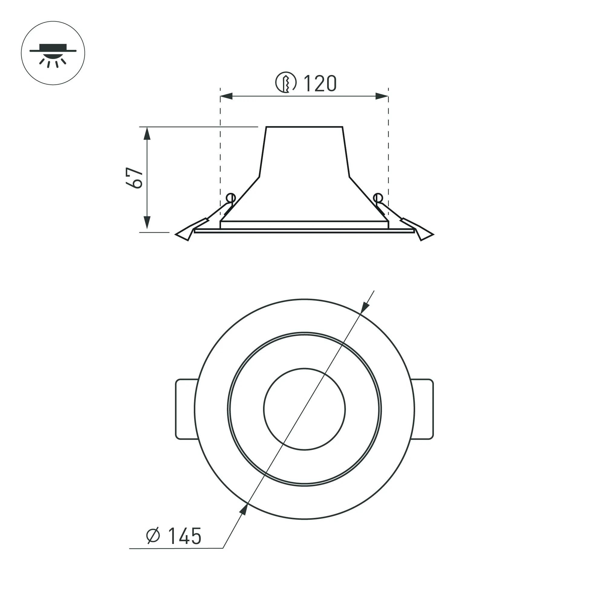 Светильник даунлайт с изменяемой цветовой температурой и переключателем на корпусе. Мощность 15 Вт, св. поток 1613-1751 лм, 92 лм/Вт, белый 6000К, или дневной 4000К, или теплый 3000К (выбор цвета свечения при установке, фиксированный), CRI>80, угол 80°, напряжение питания 230 В. Белый круглый корпус из алюминия, степень защиты IP20. Размер: диаметр 145 мм, высота 67 мм. Монтаж встраиваемый, установочное отверстие: диаметр 120-130 мм. Драйвер 14-23 В, 700 мА, пульсация <0,7%.