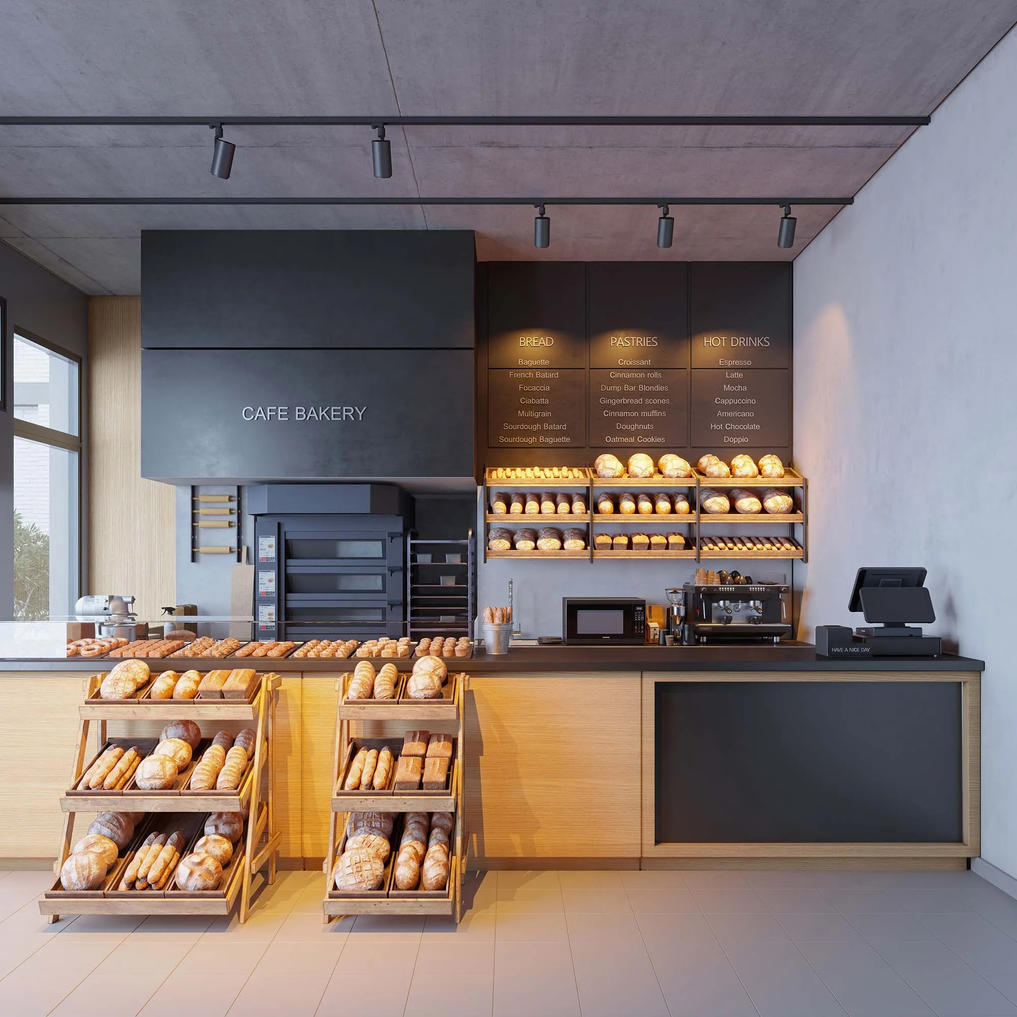Светильник для треков/шин 4 провода для продуктов. Мощность 30 Вт, св. поток 1763 лм, 59 лм/Вт, специальный теплый 2500K для выпечки, изменяемый угол 20-60°, напряжение питания 230 В. Черный корпус из алюминия, материал линзы PMMA, степень защиты IP20. Размер: диаметр 100 мм, высота 220 мм. Монтаж на трек 3-фазный. Драйвер 33-44 В, 750 мА, пульсация <1%.
