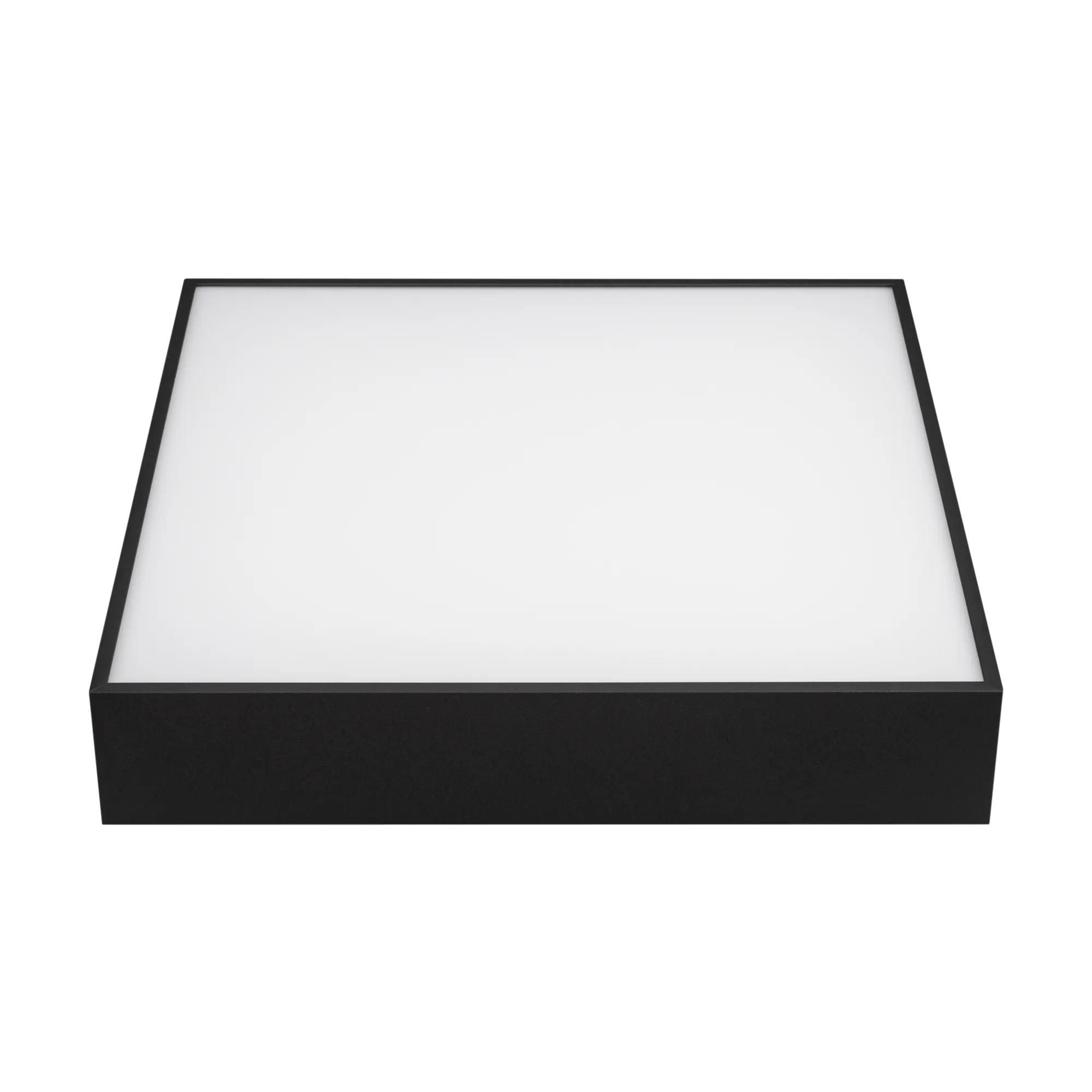 Поставка под заказ от 100 шт. Накладной светильник. Мощность 30 Вт, св. поток 2000-2540 лм, 85 лм/Вт, теплый 3000 K, CRI>90, угол 120°, напряжение питания 230 В. Черный квадратный корпус из алюминия, экран PC, степень защиты IP40. Размер: длина 350 мм, ширина 350 мм, высота 64 мм. Монтаж накладной. Драйвер 27-42 В, 800 мА, пульсация <5%.