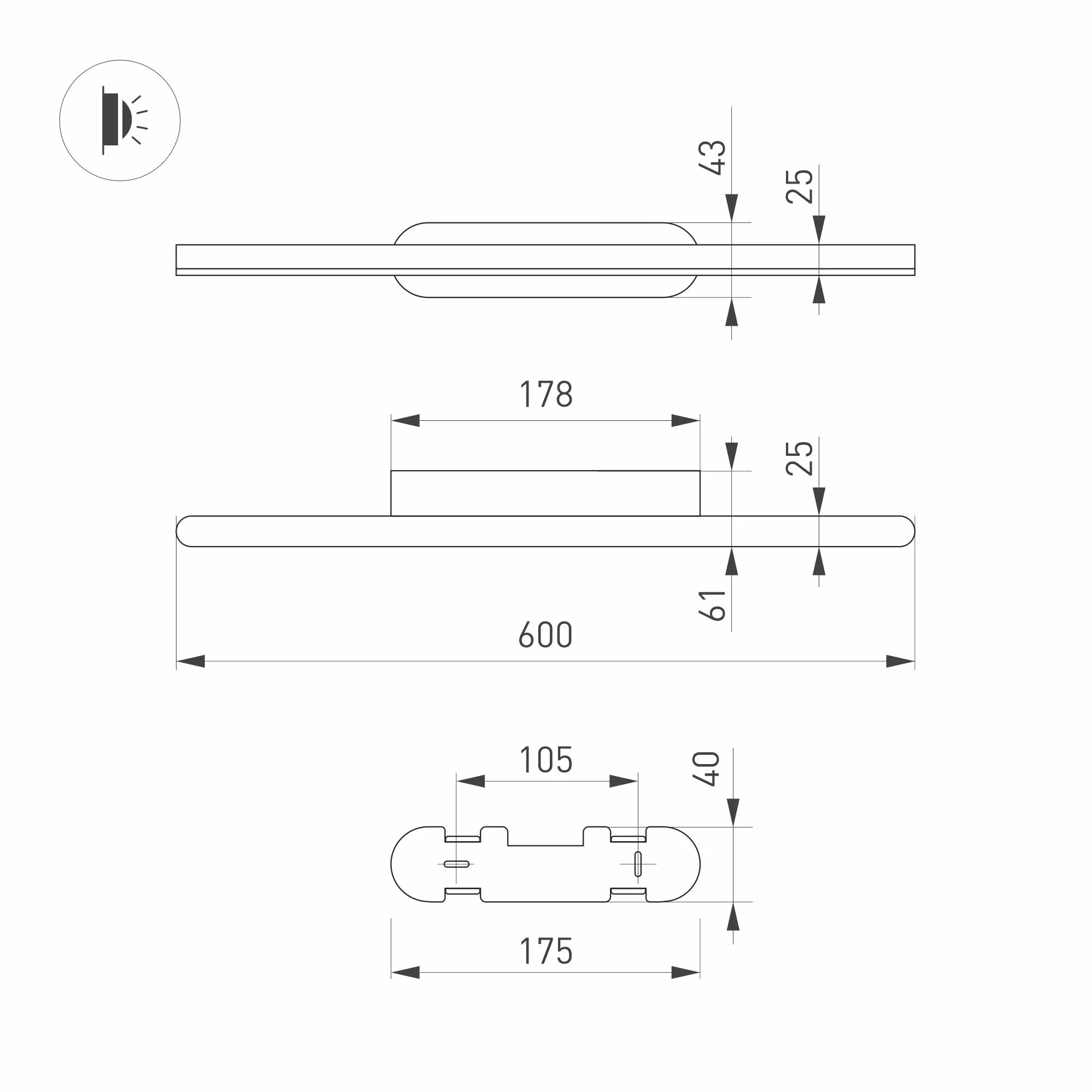 Декоративный настенный светильник. Мощность13 Вт, св. поток 600 лм, 50 лм/Вт, теплый 3000 K, CRI>90, угол 120°, напряжение питания 230 В. Черный фигурный корпус из алюминия, экран из матового поликарбоната, степень защиты IP54. Размер: длина 600 мм, ширина 55 мм, высота 65 мм. Размер светоизлучающего модуля: длина 600 мм, ширина 25 мм, высота 25 мм Монтаж накладной. Пульсация <0,5.