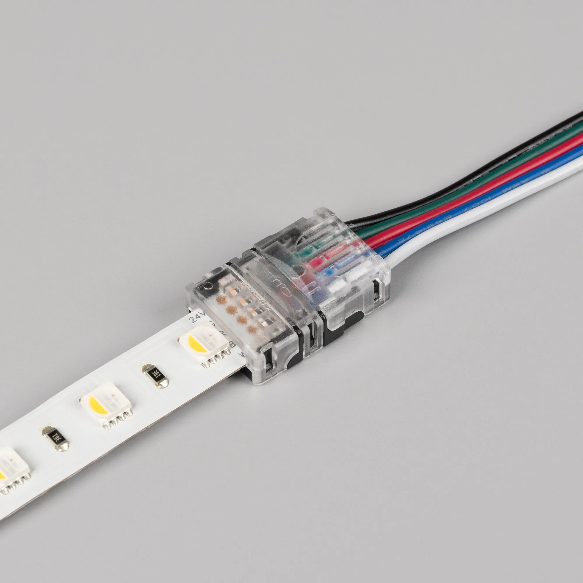 Одиночный коннектор (без провода) для подключения питания к открытым лентам RGBW шириной 12 мм. Очистка провода питания (0,5-1,0 мм2) от изоляции не требуется. Материал - прозрачный пластик. Максимальный допустимый ток 3 А, напряжение 3-24 В, степень защиты IP33. Цена за 1 шт.