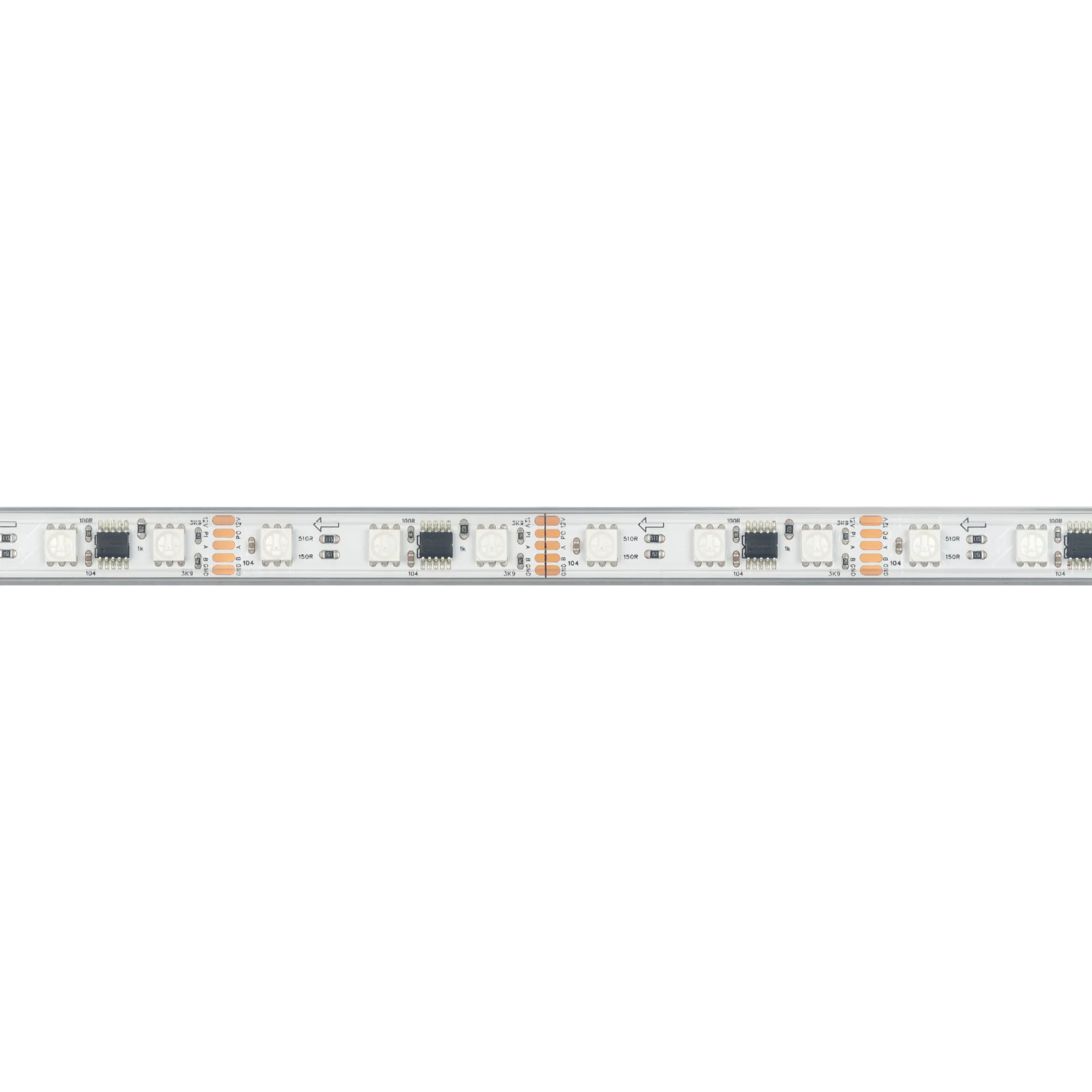 Светодиодная герметичная лента DMX серии B60 с микросхемой GS8516 (GS8526), IP67 (PS - силиконовая экструзия). Светодиоды SMD 5060, 60 шт/м, 20 pixels на 1 м (100 pixels на 5 м), 1 pixel = 3 светодиода, белая плата шириной 10 мм, скотч 3М. Цвет RGB, угол 120°. Питание 12 В, мощность 14 Вт/м (70 Вт на 5 м). Размеры 5000x12x5 мм. Мин. отрезок 50 мм, 3 светодиода. Цена за 1 м.