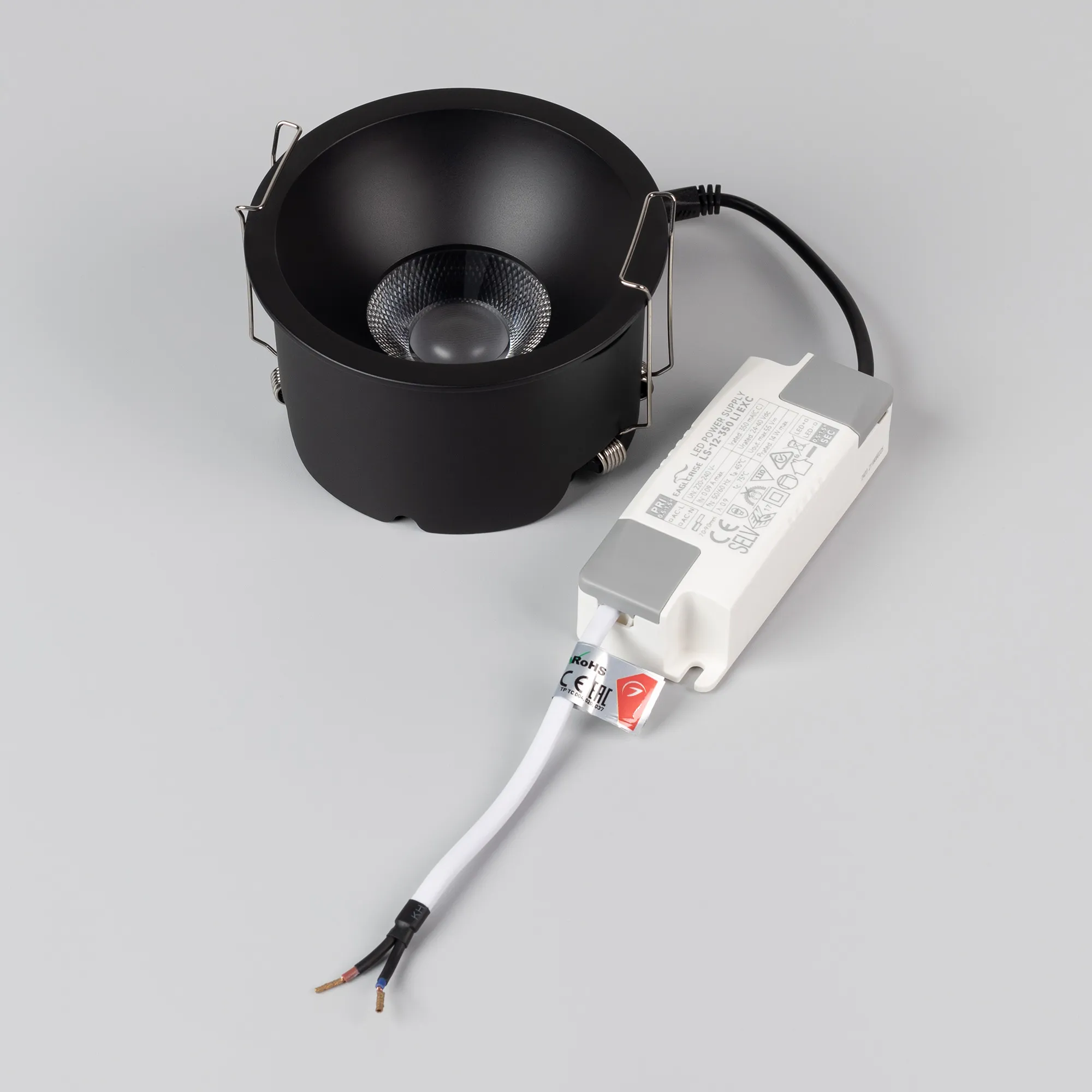 Встраиваемый светильник даунлайт. Мощность 15 Вт, св. поток 1260 лм, 84 лм/Вт, дневной 4000 K, CRI>90, угол 24°, напряжение питания 230 В. Чёрный круглый корпус из алюминия, степень защиты IP20. Размер: диаметр 106 мм, высота 63 мм. Монтаж встраиваемый, установочное отверстие: диаметр 95 мм. UGR<14. Драйвер 27-40 В, 350 мА, пульсация <2%.
