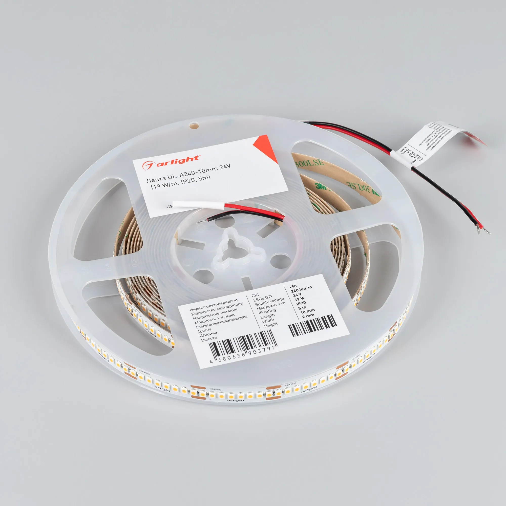 Светодиодная лента UL серии A240. Светодиоды SMD 2835, 240 шт/м, белая плата шириной 10 мм, скотч 3M. Цвет ТЕПЛЫЙ 2700K, индекс цветопередачи CRI>90, угол 120°. Питание 24 В, мощность 19 Вт/м (95 Вт на 5 м). Размеры 5000x10x2 мм. Мин.отрезок 33.33 мм, 8 светодиодов. Цена за 1 м. Обязательная установка на профиль.