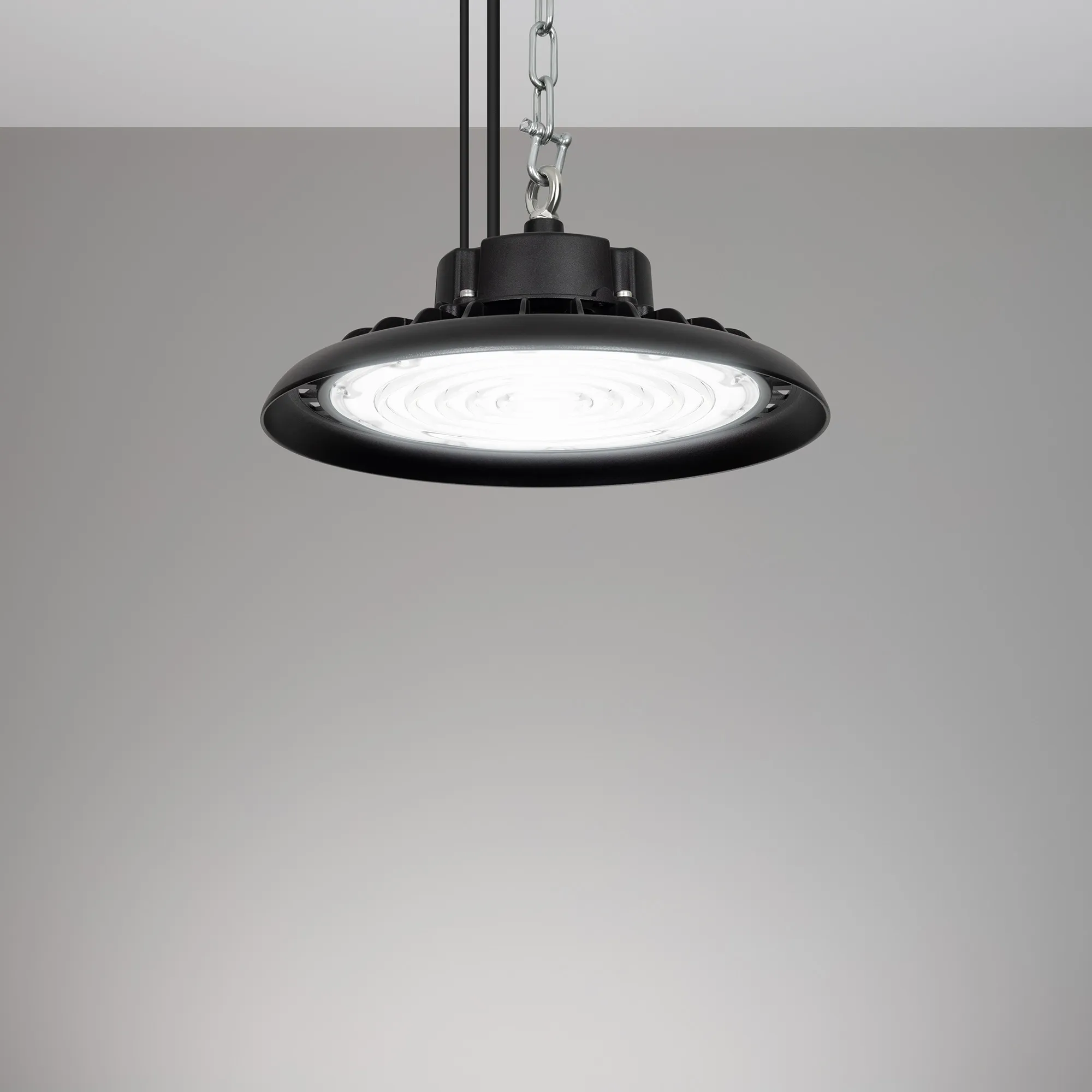 Светильник для освещения складских и промышленных помещений. Мощность 150W, напряжение питания AC 120-270V/50Hz. CRI 80. Тип светодиодов SMD2835, с групповой оптической линзой. Цвет свечения ДНЕВНОЙ 5000K, световой поток 22500 Lm, угол рассеивания 90°. Доступно управление по протоколу 0-10В. Цвет корпуса черный, линза из поликарбоната, степень влагозащиты IP65, ударопрочность IK08. Габариты Ф300xH140мм. Рым-болт в комплекте. Длина кабеля питания 900 мм, кабеля 0-10 200мм.