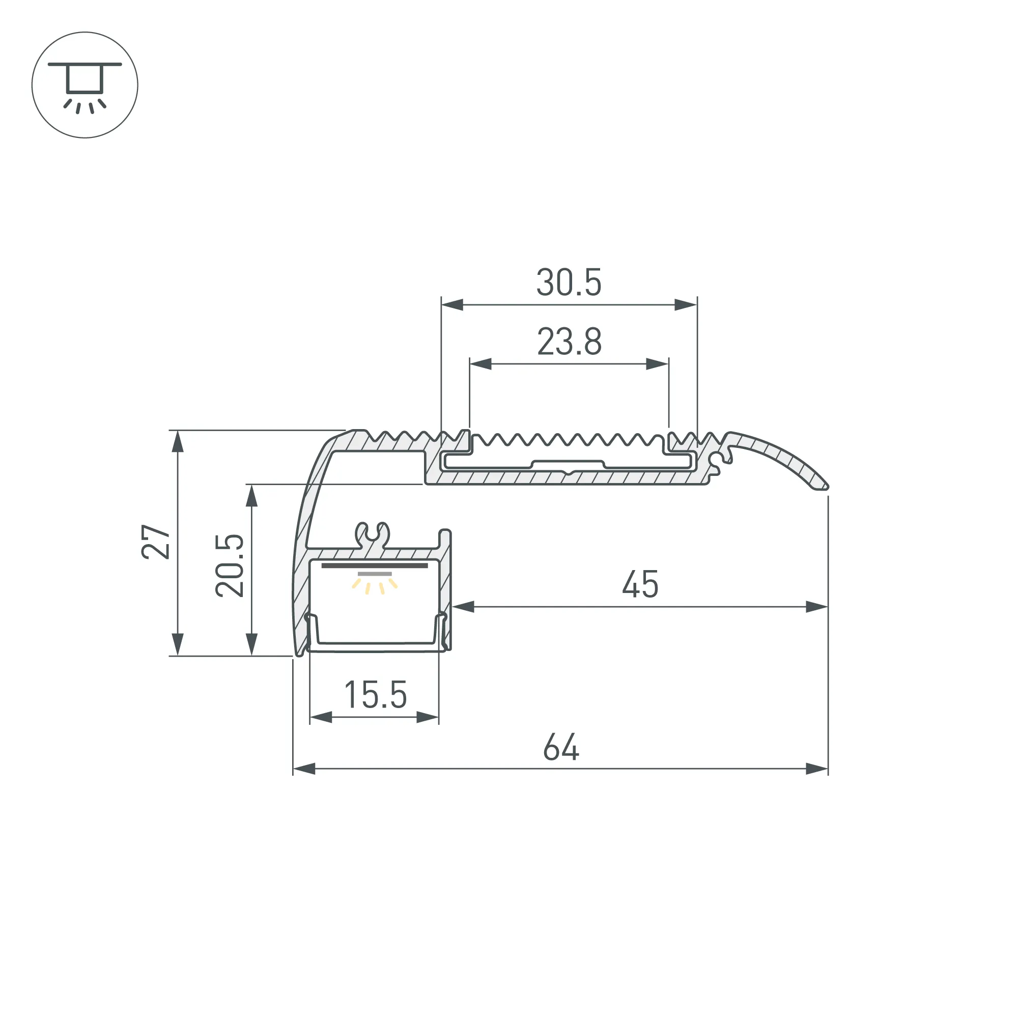 Алюминиевый анодированный накладной профиль для ступеней. Антискользящая вставка идет в комплекте с профилем. Цвет - черный. Габаритные размеры (L×W×H): 2000x64x27 мм (накладная часть на ступеньку 45 мм). Ширина площадки для ленты 15,5 мм. Экраны и заглушки приобретаются отдельно. Цена за 1 м.