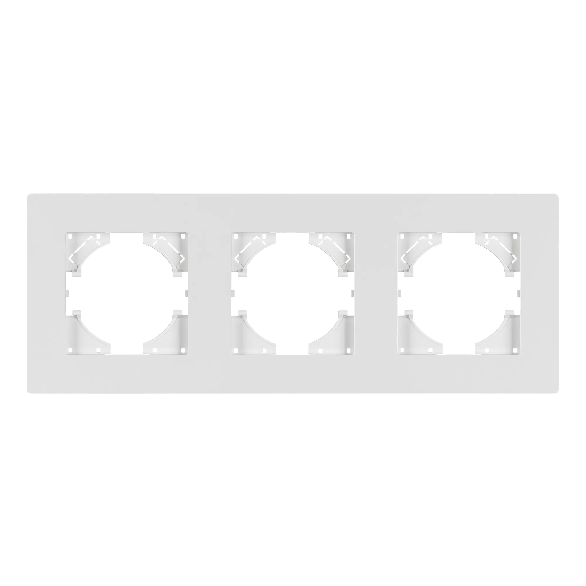 Рамка пластиковая на 3 поста, под встраиваемый механизм. Цвет - белый. Уровень герметичности IP20. Ориентация монтажа - горизонтальная (основным ориентиром служат посадочные выступы для накладки механизма).