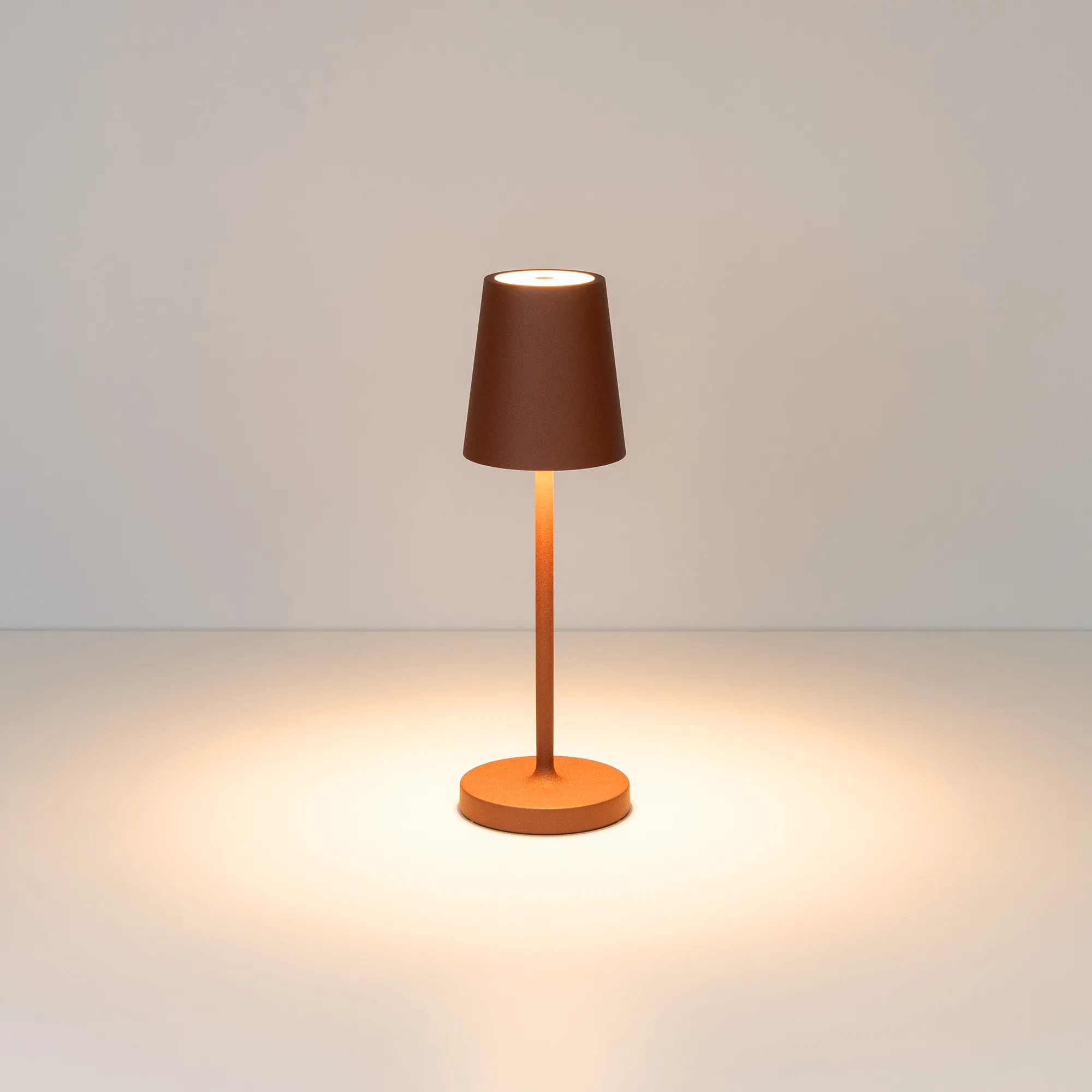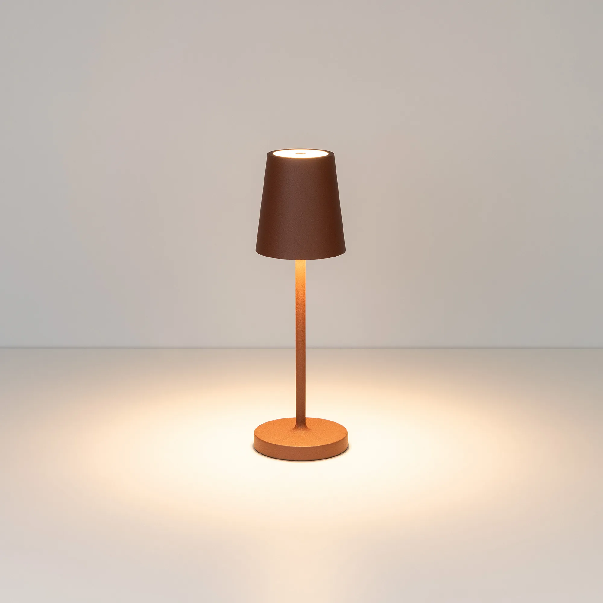 Настольный светильник со встроенным аккумулятором 1.5Вт, алюминиевый корпус, цвет терракотовый. Цвет ТЕПЛЫЙ БЕЛЫЙ 2200-2700-3000K, св.поток 110-130 лм, CRI(Ra)>80, угол 90°. Размер Ф75x250мм. IP54. Зарядка от сети переменного тока AC220-240V. Тип встроенного аккумулятора 1500мАч Li-ion, напряжение батареи 3.7V