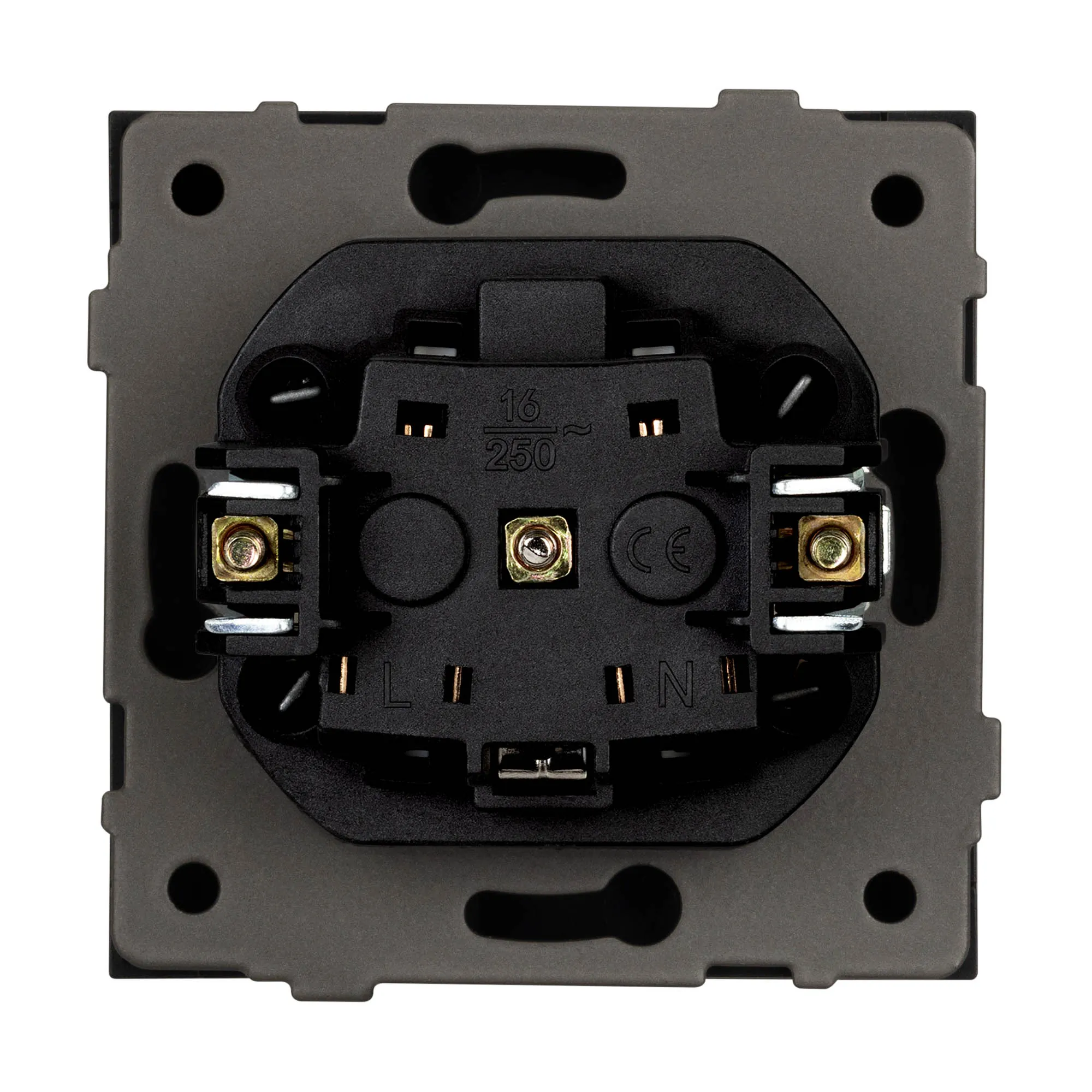 Механизм розетки с заземлением и влагозащитной крышкой на 1 пост. Цвет - матовый графитовый, с Soft-Touch покрытием. Без фронтальной рамки. Уровень пылевлагозащиты IP44. Розетка устанавливается в стандартный подрозетник круглого сечения диаметром 60мм.